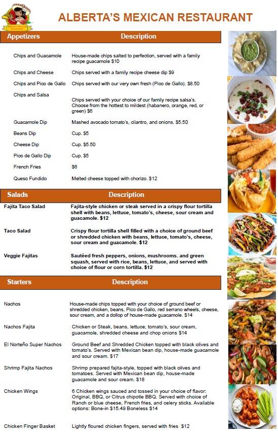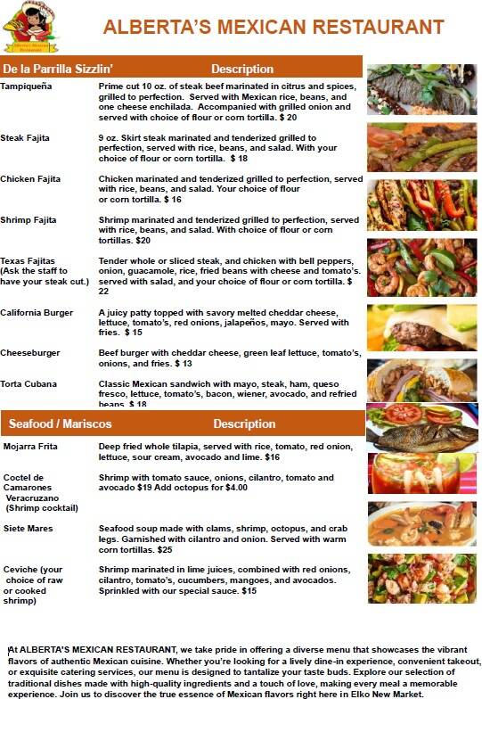 At ALBERTA'S MEXICAN RESTAURANT, we take pride in offering a diverse menu that showcases the vibrant flavors of authentic Mexican cuisine. Whether you’re looking for a lively dine-in experience, convenient takeout, or exquisite catering services, our menu is designed to tantalize your taste buds. Explore our selection of traditional dishes made with high-quality ingredients and a touch of love, making every meal a memorable experience. Join us to discover the true essence of Mexican flavors right here in Elko New Market.